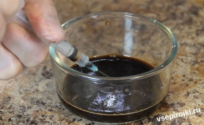 Для начала смешиваем в маленькой миске соевый соус и сок лимона. Далее набираем этот «маринад» в шприц.