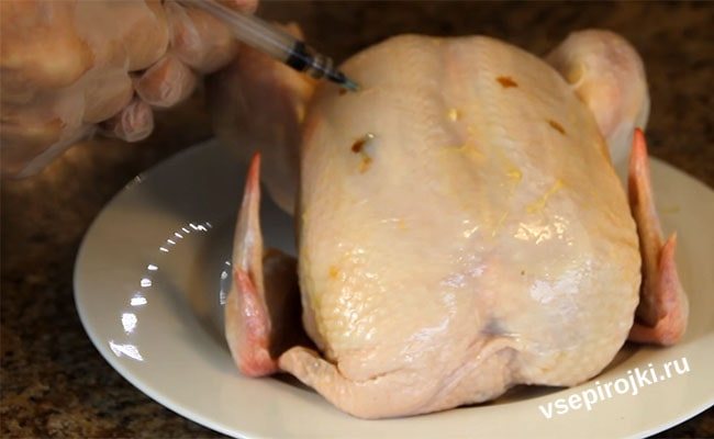 А теперь начинаем прокалывать в разных местах куриное мясо, вводим немного соуса. Проходимся по грудке, по ножкам, обкалываем со всех сторон.