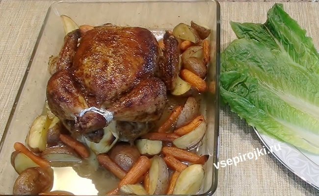Отравляем курицу в разогретую до 180 градусов духовку примерно на 1,5 часа. Форма должна располагаться по центру, чтобы жар сверху чересчур не обжигал курицу.