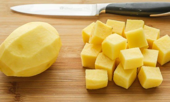 Картоплю чистимо, добре миємо, нарізаємо кубиками, за бажанням відварюємо до напівготовності, але можна використовувати і повністю сиру картоплю