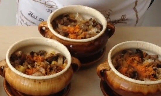 Викласти грибну обсмажування у горщики.