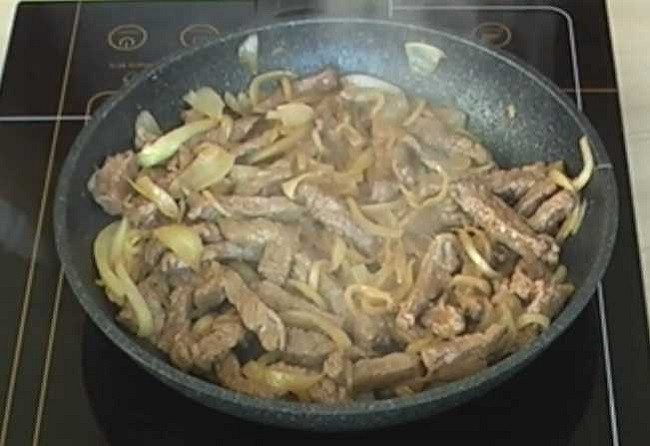 - Мясо обжаривается на небольшом количестве масла до полуготовности. К нему добавляется мелко нарезанный лук и смесь тушится до мягкости.