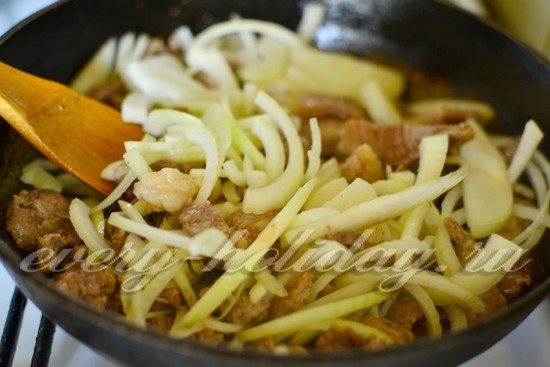 - 1 морковь и 2 луковицы нарезать полукольцами, соединить с мясом и зажаркой.