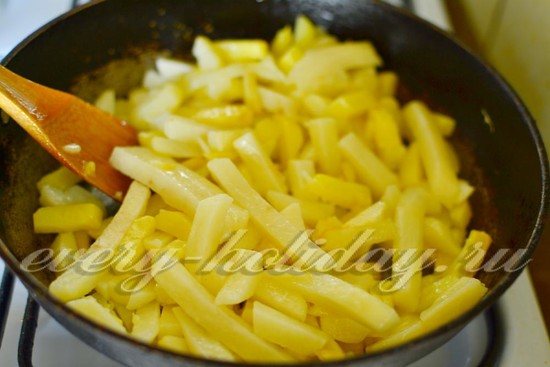 - Нарезать соломкой 5 небольших картофелин и пожарить отдельно в сковороде. Переложить их к основным ингредиентам.