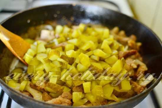 - Нарезать мелко 3 маринованных огурца, а 2 большие луковицы кольцами и добавить к мясу. Перемешав, жарить до готовности лука.