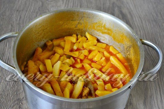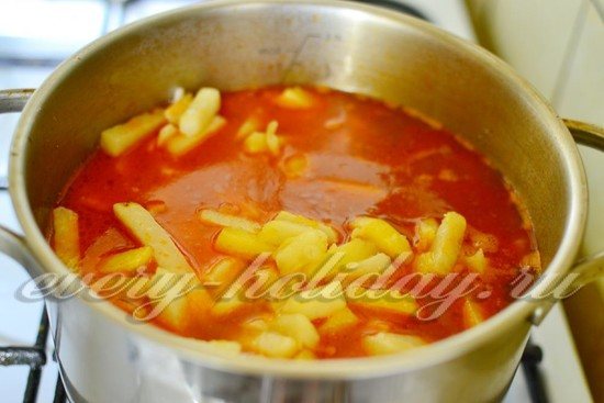 - Вся смесь перекладывается в кастрюлю, туда же добавляется нарезанный картофель и сок с водой — столько, чтобы все ингредиенты были покрыты.