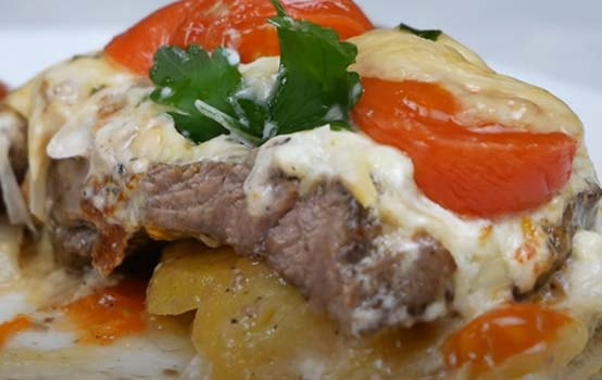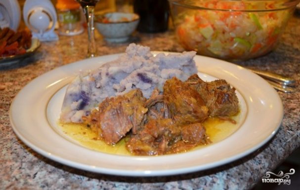 Особливим інгредієнтом є солоний огірок. Важливо гасити шматочки м’яса в густому томатному соусі, рясно прикрашаючи свіжою зеленню. Смажити м’ясо потрібно на олії, а картопля – на вершковому.