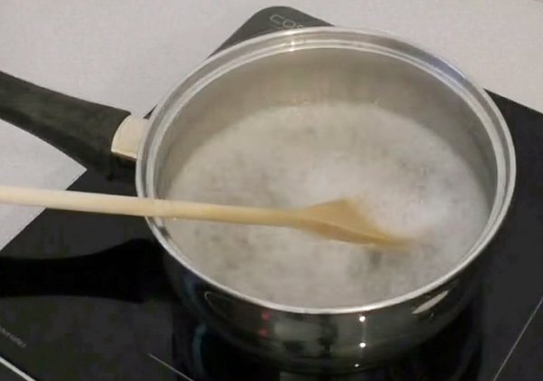 4. Для цукрового сиропу воду з агар-агаром поставити на вогонь і досягти повного розчинення, тільки після цього додаємо 300 гр. цукру, який на момент закипання повинен повністю перейти в розчин. Варимо до температури 106-110 гр., До товстої нитки, на практиці це близько 2-3 хв.