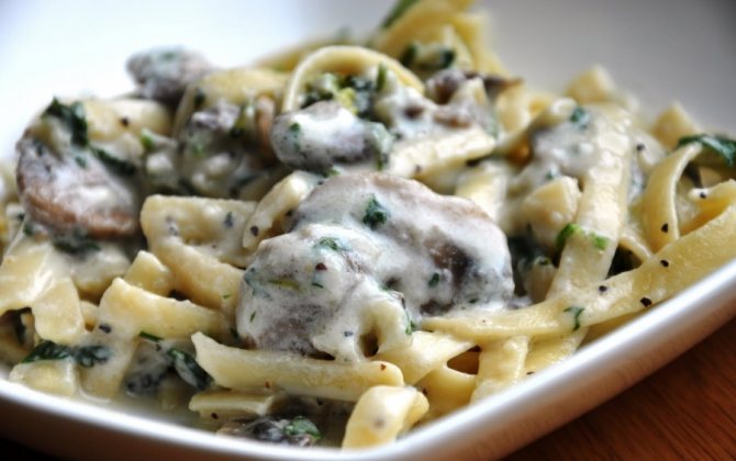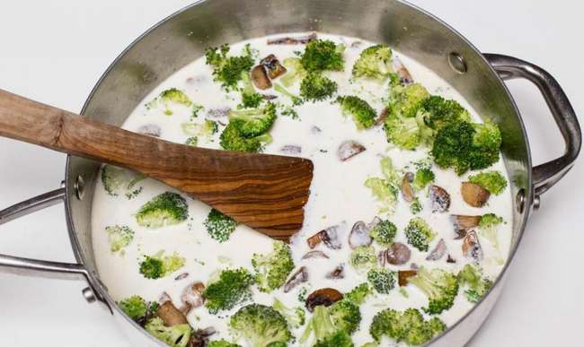 Після закінчення цього часу додати в цю смачну страву з печериць та броколі сметану і гасити ще 5 хвилин на повільному вогні.
