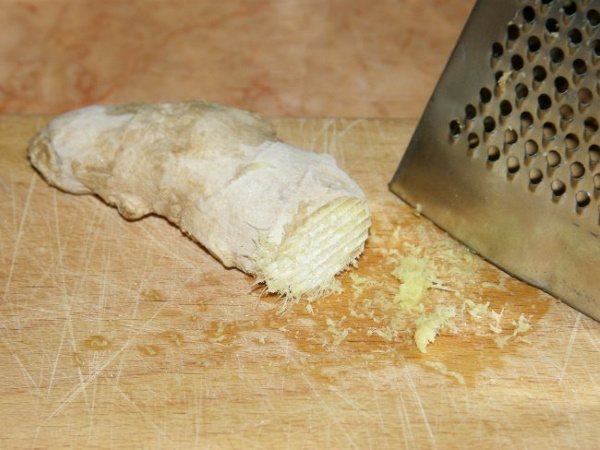 4. Імбир потрібно подрібнити на малій тертці і помістити до інших продуктів, прогрів склад ще близько 2 хв.