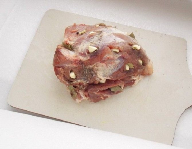 - Для рецепту взяти незбиране м’ясо без кісток і жилок, в якому є трохи жиру. М’ясо прополоскати в проточній воді, обсушити паперовим рушником і нашпигувати прянощами та спеціями, попередньо зробивши надрізи глибиною близько 1,5 см. У кожен втерти сіль, перець мелений, покласти по шматочку лаврового листа, горошину перцю, частину очищеної часникової частки.