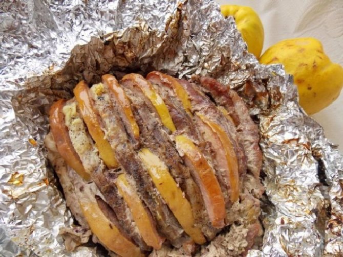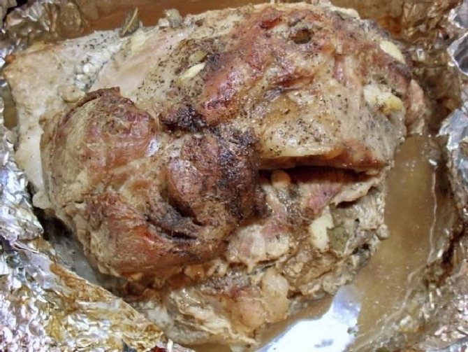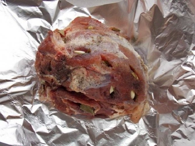- На цей раз щільно загорнути свинину у фольгу, прибрати далі, запікатися в духовку на одну або півтори години в залежності від розміру шматка.