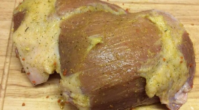 - Гірчицю розітріть з олією, додайте пропущений через прес часник, приправи та сіль. Обмажте шматок свинини сумішшю, що вийшла. Покладіть м’ясо в цупкий пакет.