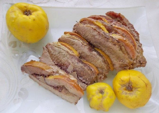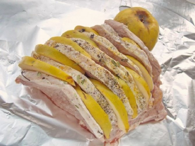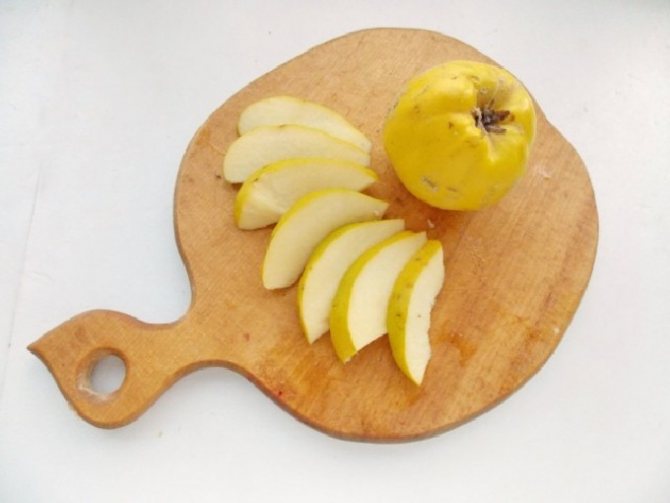 - Після закінчення зазначеного часу підготувати айву. Добре її вимити, шкірку не знімати. Розділити на половинки, прибрати тверду серцевину, насіння. Нарізати часточками айву близько 5 мм завтовшки.