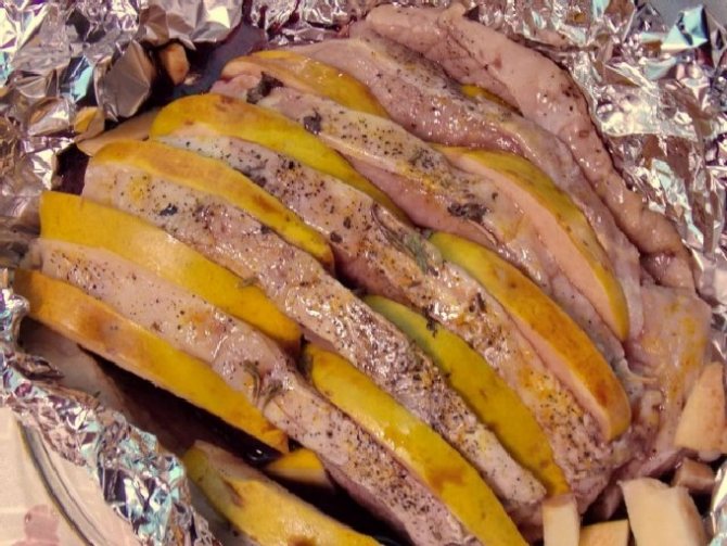 - Обмазати свинину з усіх боків великою кількістю гірчиці. Накрити бічними шматками фольги, поставити в холодильник маринуватися на всю ніч.