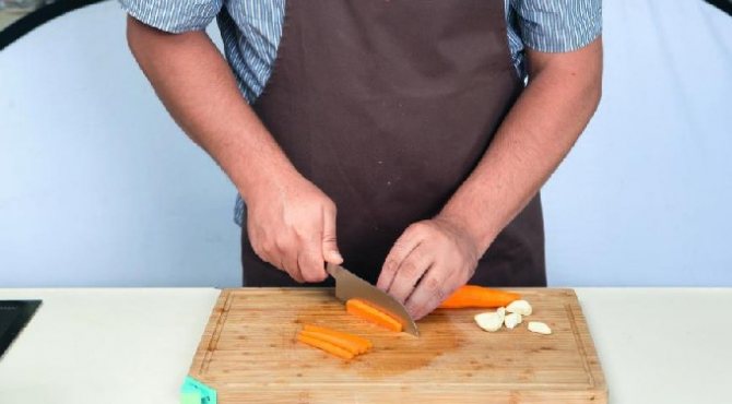 - Духовку заздалегідь розігріти до 240 градусів. З часнику зняти лушпиння і розібрати його по зубчиках, очистити. Моркву пошкребти і промити. Нарізати часник і моркву тонкими брусочками, трохи посолити і поперчити.