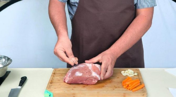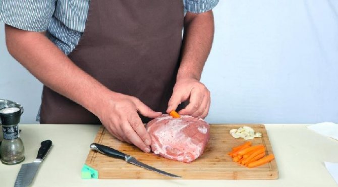 - У м’ясі зробити неглибокі надрізи, в які вставити по шматочку моркви та часнику.