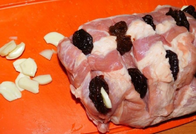 - Шматок м’яса промити під проточною водою, викласти в друшляк, щоб стекла вода, після чого обсушити паперовим рушником. У шматку свинини на поверхні зробити надрізи гострим ножем глибиною близько 1,5 см. Часник очистити та нарізати тонкими пластинками. Чорнослив залити окропом і дати постояти 5 хв, після чого промити і віджати воду. У кожен надріз вставити чорнослив та шматочки часнику.