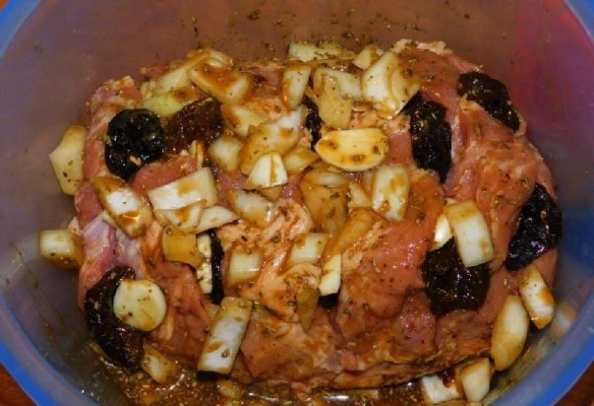- Натріть свинину приправами та сіллю, покладіть у пакет, залиште на 2-3 години.