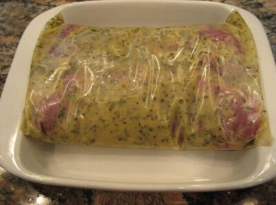 - Зранку духовку нагріти до 200 градусів. М’ясо дістати з холодильника та перекласти в сковороду або форму для запікання, не знімаючи фольги.