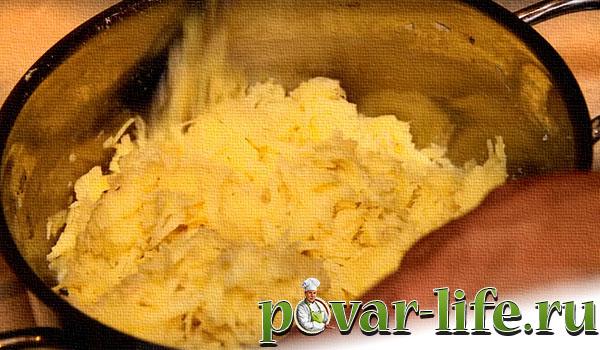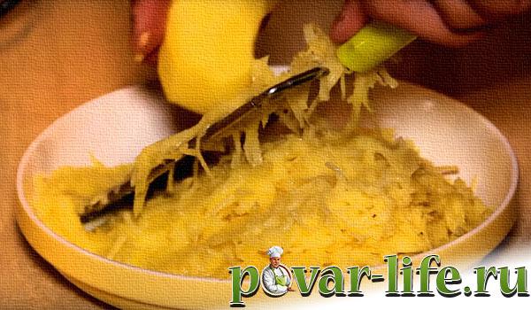 - Картопляне пюре необхідно приготувати за традиційним рецептом, розділивши на 4 частини. 1 частину варять і перетворюють на пюре, решту 3 частини подрібнюють у блендері або труть на тертці. Сирий картоплю віджимають, збирають крохмаль, що випав, і додають його в тісто. Змішують сиру та варену картоплю, ретельно перемішують.