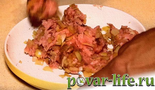 - М’ясо прокручують на м’ясорубці із додаванням цибулі. У фарш додають сіль та інші спеції до смаку.