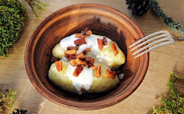 - Як соус можна використовувати звичайну сметану, а можна приготувати традиційний соус зі смажених шкварок. Для цього дрібно нарізане сало обсмажують разом із цибулею.