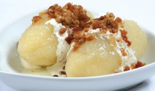 Зварені галушки дістають із води і, попередньо полив соусом, подають до столу.