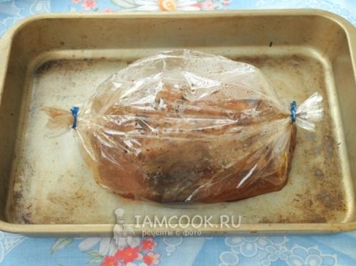 Мясо положить в рукав для запекания и завязать с двух сторон. Сверху сделать 2-3 прокола иголкой для выхода пара.