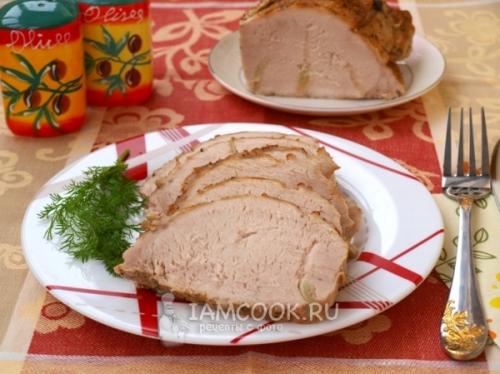 Поставить мясо в холодную духовку и выставить температуру 180 градусов. Запекать 1 час. Затем мясо немного остудить, слить мясной сок. После того как полностью остынет, убрать в холодильник.