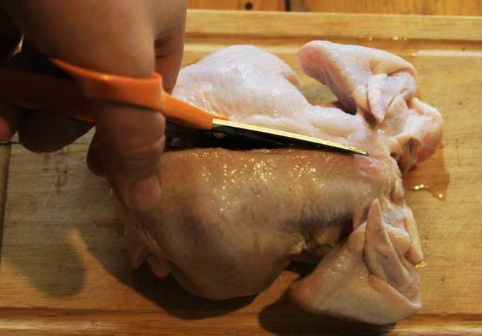 2. Курицу промываем, срезаем лишнюю кожу и жировые участки, после чего тщательно обсушиваем бумажным полотенцем. Укладываем тушку грудкой вверх и разрезаем ее по грудной клетке, не задевая спинку. Разрез можно делать как острым ножом, так и крупными кулинарными ножницами.