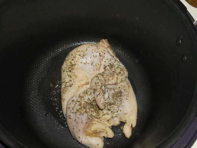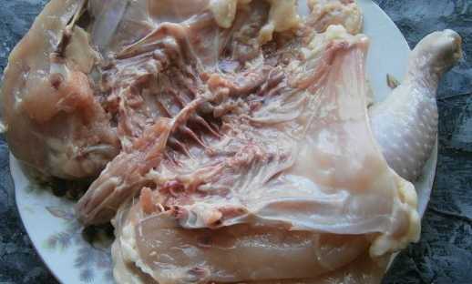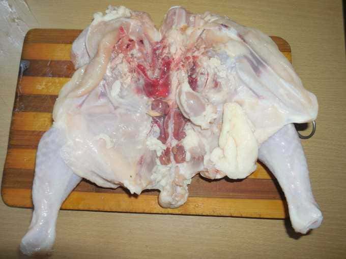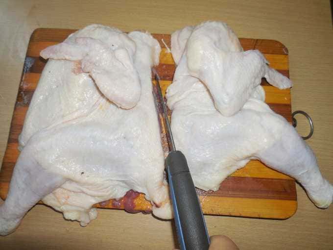 1. Домашнего цыпленка помыть (можно использовать и цыпленка из магазина), разрезать пополам посередине грудки