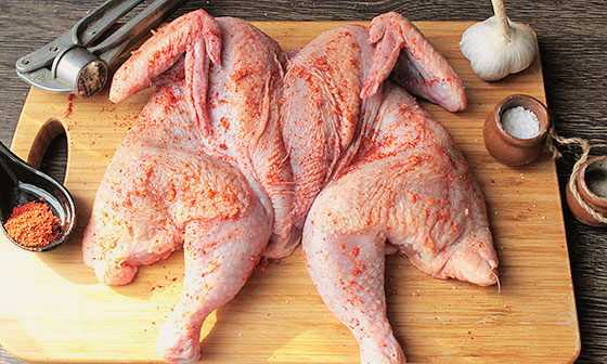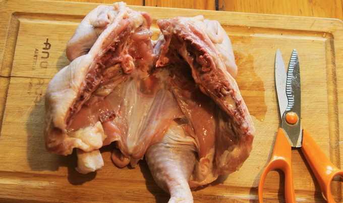 • Курицу промываем, лишнюю кожу и жировые участки лучше срезать. Затем тщательно обсушиваем тушку бумажным полотенцем, чтобы удалить влагу. Укладываем курицу грудкой вверх и разрезаем ее вдоль по грудной клетке, не задевая спинку. Разрез можно делать как острым ножом, так и крупными кулинарными ножницами. Раскрываем тушку в горизонтальную плоскость.