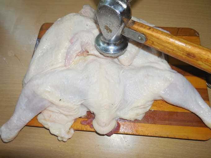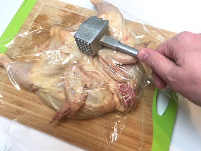 4. Покрываем курицу пищевой пленкой и отбиваем кухонным молотком, чтобы сломать косточки. Прикладываем усилия именно к скелету, а не к мясу – нужно, чтобы тушка потеряла жесткую форму и стала податливой.