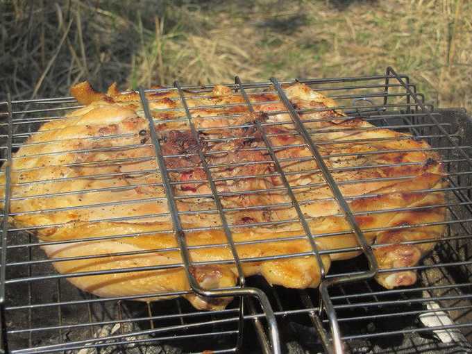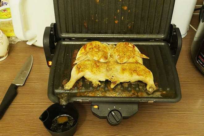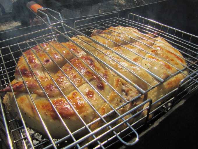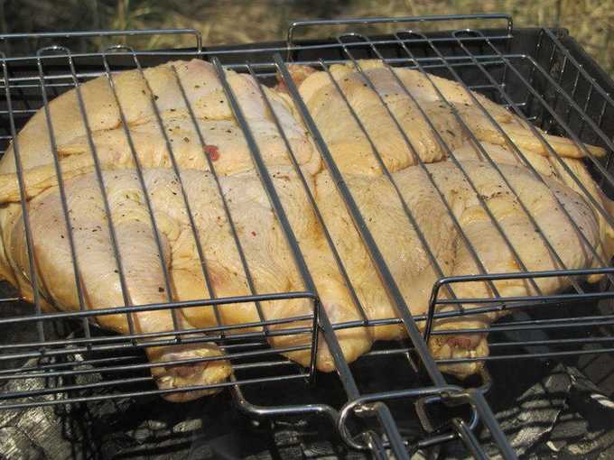 • После маринования курицу извлекаем, даем жидкости самостоятельно стечь, не вытирая ее. Часть маринада сохраняем. Укладываем тушку на решетку и фиксируем ее, закрыв обе половинки приспособления.