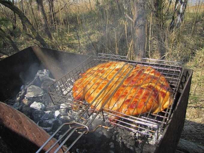 • Жарим курицу на мангале над тлеющими углями. Следим, чтобы не было открытого огня или слишком сильного жара. При необходимости потушить возникающее пламя брызгаем на угли водой, предварительно убрав решетку с курицей.