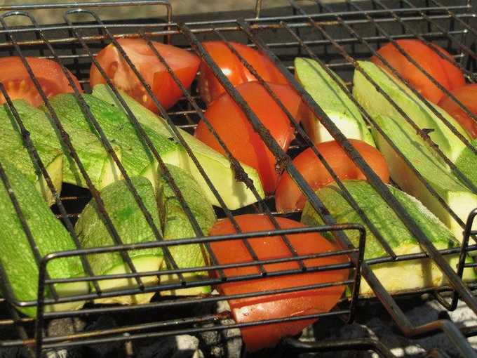 • В качестве гарнира можно порезать томаты, кабачки, баклажаны, перцы и поместить их на отельную решетку. Готовим овощи на углях, переворачивая на обе стороны, до мягкости.