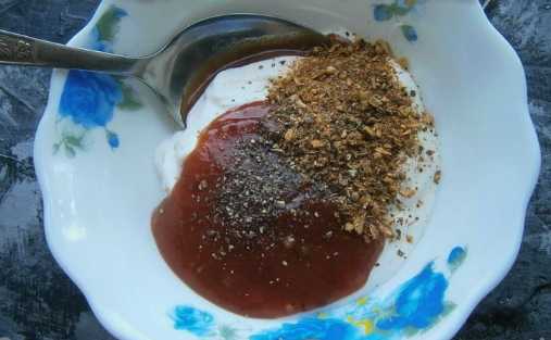 3. В миске смешать очищенный и натертый чеснок, острый кетчуп, паприку, соль, майонез