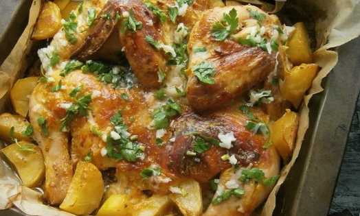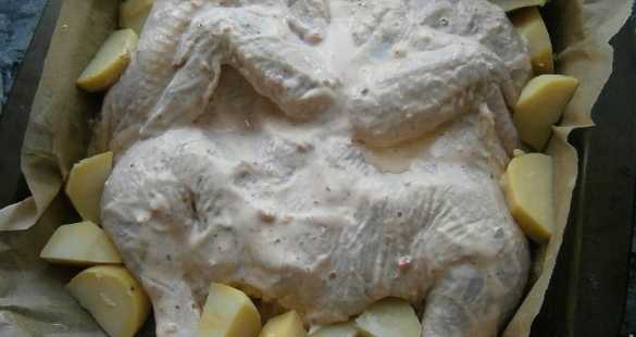 • Форму для запекания застилаем плотным пергаментом или фольгой блестящей стороной вверх. Смазываем растительным маслом. Отварной картофель нарезаем дольками или небольшими кусочками и выкладываем в форму. Подготовленную тушку курицы смазываем со всех сторон полученным маринадом и размещаем ее поверх картофеля в форму. Часть маринада распределяем также и по картошке. Духовку заранее разогреваем до температуры 180 градусов и устанавливаем форму с курицей на средний уровень. Запекаем тушку до выраженной румяной корочки. Ориентировочное время запекания – пятьдесят минут.