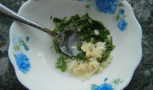 Зелень хорошо промоем, мелко порубим острым ножом. Чеснок пропускаем через пресс, с лимона снимаем цедру, натерев его на тёрке. Все подготовленные компоненты смешиваем между собой.