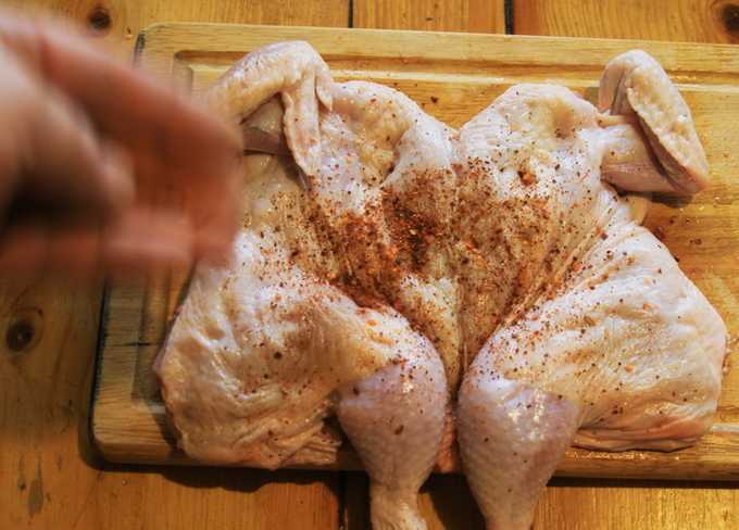 5. Посыпаем отбитую птицу солью, черным молотым и красным острым перцем. Втираем специи руками в поверхность тушки.