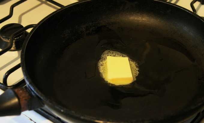 6. На сковороду выливаем растительное масло и кладем кусочек сливочного. Разогреваем смесь на плите до жидкого состояния.