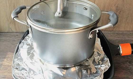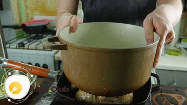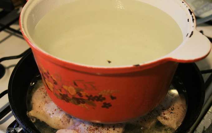 8. Если в наличии есть специальная крышка с прессом – самое время ее использовать. В ином случае накрываем тушку тарелкой или крышкой чуть меньшего диаметра, чем сама сковорода. Если это тарелка, то располагаем ее дном вверх. Сверху устанавливаем груз. Это может быть, например, камень либо небольшая кастрюля или чайник, наполненный водой. На данном этапе задача состоит в том, чтобы максимально прижать тушку ко дну сковороды для равномерного и быстрого зажаривания. Температура плиты – средняя. Засекаем время: жарим цыпленка табака по пятнадцать минут с каждой стороны. Стоит упомянуть, что время жарки напрямую зависит от веса и размера тушки. Если это птица более килограмма, то и жарится она будет дольше.