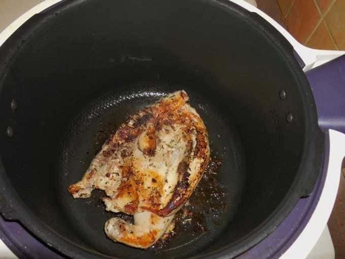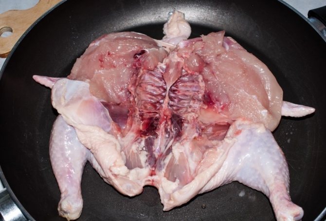 7. На разогретую сковороду укладываем подготовленную птицу спинкой вверх.