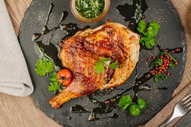 • Для готовки возьмите небольших цыплят, половина которых легко поместится в порционную тарелку. В отдельных случаях можно разделить на 4 части тушку большой курицы и подавать порционно.