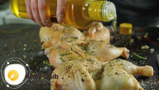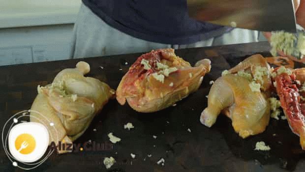 1. Разрезать две тушки цыпленка вдоль. Измельчить 4 зубчика чеснока и натереть ими мясо.