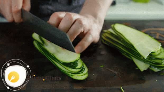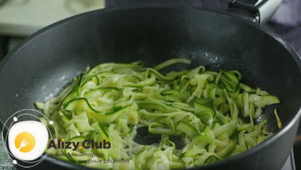 5. Нашинковать 2 цукини тонкими пластами. Длинным острым ножом нарезать спагетти из цукини. Добавить соль, перец и оливковое масло по вкусу и оставить на 5-10 минут.