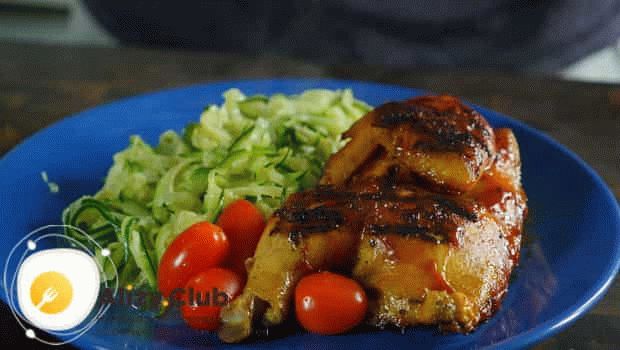 3. Вкладываем промариновавшуюся курятинку на гриль и зажариваем с каждой стороны по полчаса (можно немного меньше). Готовое яство подаем к столу в компании со свежими овощами.