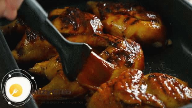 6. Сделать соус. Для этого смешать 1 ст. л. растопленного меда, 1 ст. л. томатной пасты и 1-2 ст. л. соевого соуса для получения жидковатой массы. Смазать им верхнюю часть курицы.
