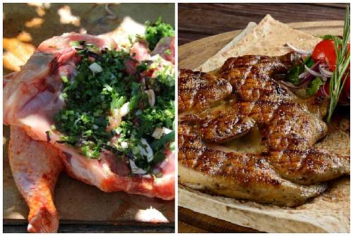 • Перед самой жаркой мясо посыпается хмели сунели и со стороны шкурки натирается аджикой